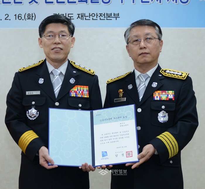 지난 16일 경기 광명소방서는 지난해 경기도 긴급구조훈련 평가에서 최우수 기관으로 선정돼 도지사 표창을 받았다. 사진은 강태석 경기도재난안전본부장(왼쪽)과 김권운 광명소방서장(오른쪽)이 기념촬영을 하는 모습.(사진제공=광명소방서)