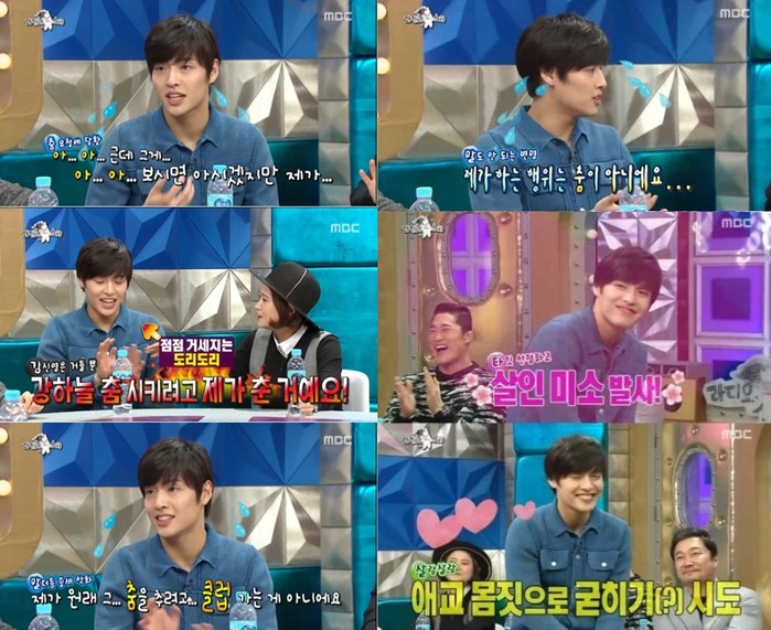 하지만 MC들은 계속 댄스를 요청해 결국 강하늘은 수줍은 미소와 함께 몸을 살짝 움직이며 리얼한 제스처와 표정으로 이들의 시선을 사로잡았다.