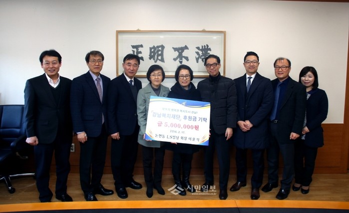 신연희 강남구청장(왼쪽에서 네 번째)이 지난 17일 오후 4시 구청에서 이윤식 LS빌딩 회장(오른쪽에서 네 번째)으로부터 '강남복지재단 후원금'을 전달받고 관계자들과 기념촬영을 하고 있다.(사진제공=강남구청)
