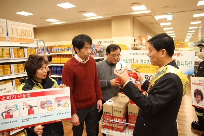 지난 17일 오후 4시 구로소방서는 새말로 소재 대형할인점에서 '주택 기초소방시설 설치 의무화'에 대한 캠페인을 실시했다. 사진은 소방서 관계자가 시민들에게 소화기 사용법에 대해 설명하는 모습.(사진제공=구로소방서)
