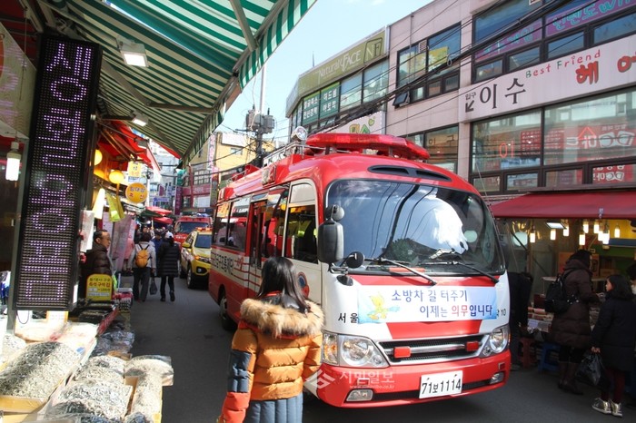 지난 17일 오후 서울 동작소방서는 사당동 남성시장에서 동작구청, 동작경찰서 등 유관기관과 합동으로 '소방통로 확보훈련'을 실시했다. 이번 훈련에는 소방차량 10대와 소방공무원 및 의용소방대 등 65명이 동원됐다.(사진제공=동작소방서)