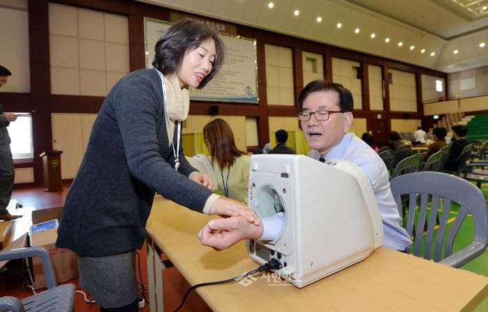지난 17일 서울 동대문구는 구청 2층 다목적 강당에서 유덕열 구청장을 비롯한 전직원이 단체헌혈 행사를 실시했다. 사진은 유 구청장이 헌혈 전 혈압을 점검하는 모습.(사진제공=동대문구청)