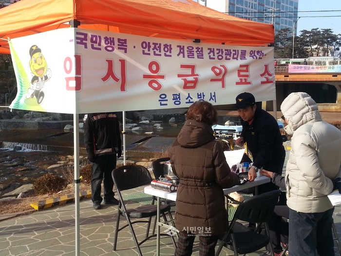 지난 17일 오후 서울 은평소방서에서는 불광천을 찾아 겨울철 건강관리를 위한 임시응급의료소를 운영했다. 사진은 응급의료소에서 대시민 건강체크(혈압 및 혈당 체크)가 진행 중인 모습.(사진제공=은평소방서)