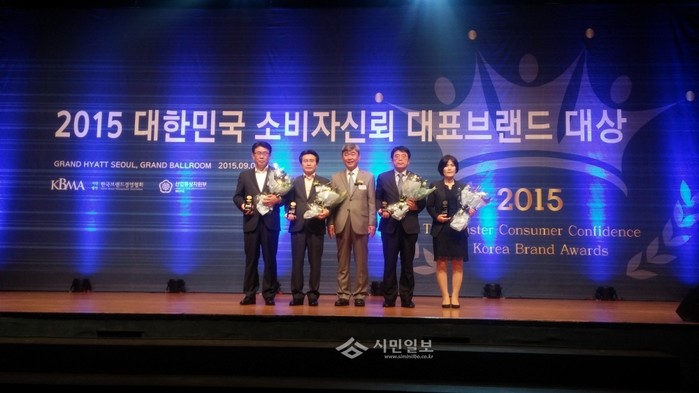 | ▲ 구미시 농특산물 공동 브랜드인 '구미별미' 가 '2015 대한민국 소비자신뢰 대표브랜드' 대상을 받은 가운데 관계자들이 기념촬영을 하고 있다. | ||