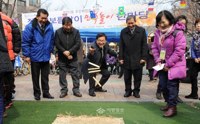 유덕열 서울 동대문구청장(가운데)이 최근 동대문구 장안1동에서 열린 정월대보름 민속놀이 한마당에 참석해 윷을 던지고 있다.(사진제공=동대문구청)