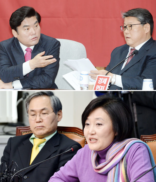19일 오전 서울 여의도 국회에서 열린 새누리당 원내대책회의에서 원유철 원내대표와 조원진 원내수석부대표가 테러방지법에 대해 말하고 있다(위). 박영선 비상대책위원이 19일 오전 서울 여의도 국회에서 열린 더불어민주당 비대위-선대위 연석회의에서 개성공단 폐쇄 관련 모두발언을 하고 있다.