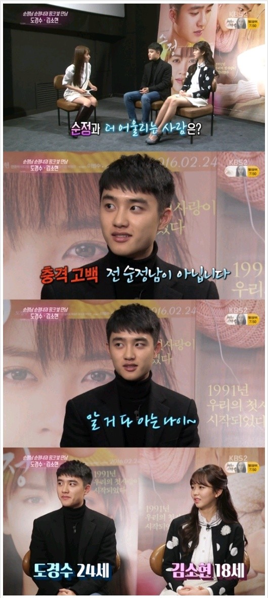 영화 제목처럼 '순정'에 더 어울리는 사람을 묻자 디오는 "전 순수하지 않다. 순정남이 아니다"고 비장한 목소리로 답했다. 디오는 "그래도 스물네살이다. 알 건 다 아는 나이다. 소현씨는 나이가 어리니까 어쩔 수 없는 것 같다"고 덧붙였다.