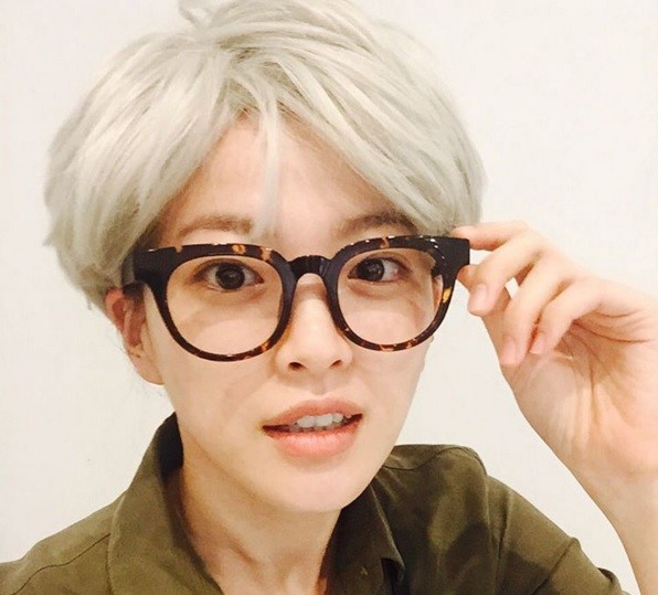 천우희는 사진 속에서 은색머리의 가발과 독특한 뿔테 안경을 쓰고 옅은 미소를 짓고있다.