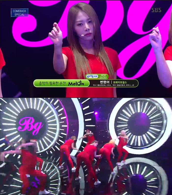 브레이브걸스가 21일 오후 3시 40분에 방송된 SBS '인기가요'에 출연해 신곡 '변했어'의 컴백무대를 선보였다. 기대와는 다르게 다소 어수선한 무대와 힘없는 가창력으로 팬들의 시선을 끌지못했다.