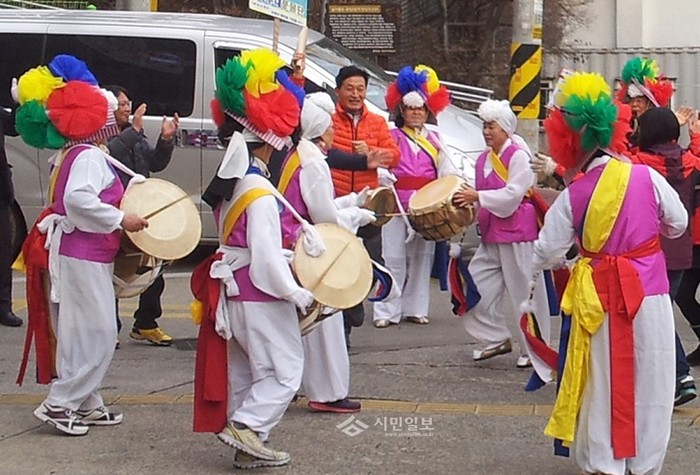 최근 경기 광명시 광명5동 길놀이 풍물단 20명이 우리 고유의 정월대보름을 맞아 광명5동 주민들과 함께 올 한 해 건강과 안녕을 기원하는 풍물소리에 맞춰 신바람 나는 춤을 추고 있다. (사진제공=광명시청)