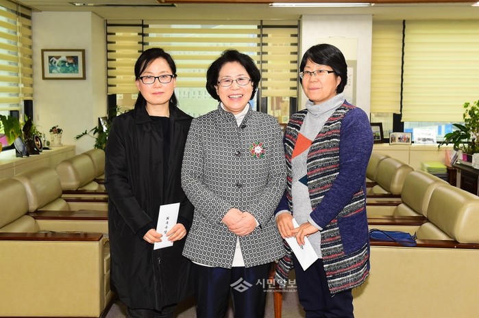 지난 19일 인천 부평구는 구청장실에서 ‘2016년도 공감글판 봄편 당선작’에 대한 시상식을 진행했다. 사진은 홍미영 구청장(가운데)과 수상자들이 기념촬영을 하는 모습.(사진제공=부평구청)