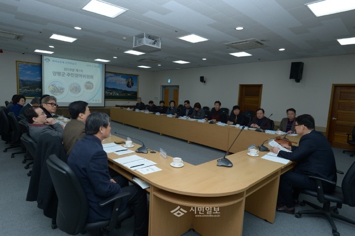 경기 양평군은 지난 19일 군청 소회의실에서 ‘2016년 제1회 양평군 주민참여위원회’를 개최했다. 사진은 김성재 부군수를 비롯한 관계자들이 회의하는 모습.(사진제공=양평군청)
