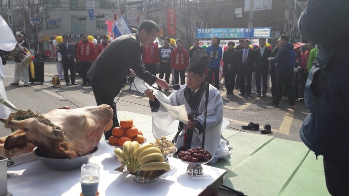 지난 20일 서울 금천구는 시흥5동 은행나무 앞에서 천년 은행나무 당고사(마을공동체의 안녕과 풍요를 기원하기 위한 의례)를 진행했다. 사진은 관계자가 마을의 번영과 안녕을 기원하는 축문을 낭독하는 모습.(사진제공=금천구청)