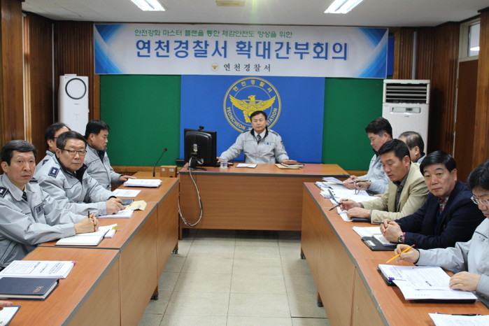 지난 19일 경기 연천경찰서는 소회의실에서 유제열 서장(가운데)을 비롯한 과장과 계장, 파출소장 등 30여명이 참석한 가운데 체감안전도 향상을 위한 확대간부회의를 진행했다.(사진제공=연천경찰서)