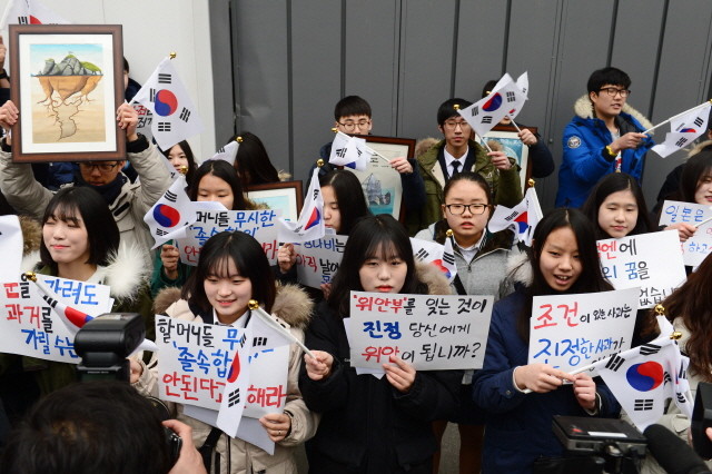 22일 오전 서울 종로구 주한 일본대사관 앞에서 열린 일본 정부 지정 '다케시마의 날' 규탄 집회에서 독도역사수호단 회원들이 태극기와 독도 그림을 들고, 일본의 '거짓 독도의 날' 즉각 철회와 위안부 한일 협정 폐지를 촉구하고 있다.