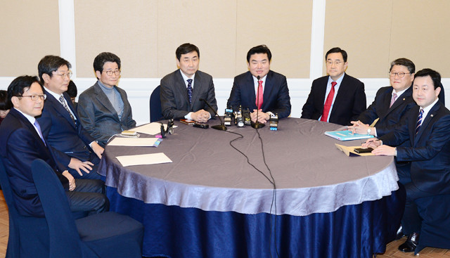 여야 원내지도부가 22일 오후 서울 여의도 국회 귀빈식당에서 열린 선거구 획정 기준안과 쟁점법안 처리를 논의하는 여야 3+3회동에서 대화를 나누고 있다. 왼쪽부터 더불어민주당 김기준 원내대변인, 이춘석 원내수석부대표, 이목희 정책위의장, 이종걸 원내대표, 새누리당 원유철 원내대표, 김정훈 정책위의장, 조원진 원내수석부대표. 김용남 원내대변인.