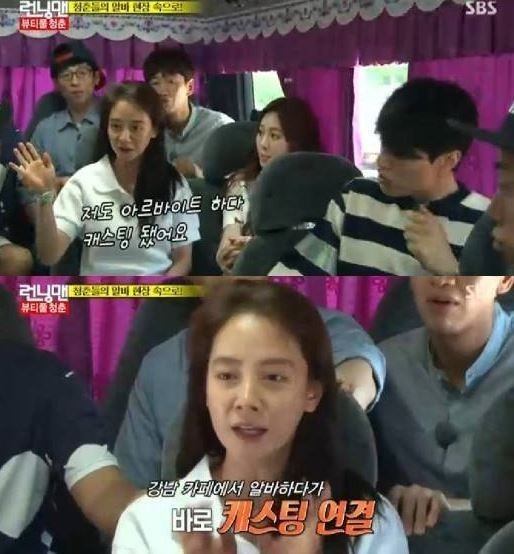 송지효는"저도 카페 아르바이트를 하다 캐스팅 됐다"면서 "백화점 맞은편에 조그마한 카페가 있었는데 사람이 안 구해진다고 일주일만 도와달라고 해서일하다가 캐스팅이 됐다"고설명했다.