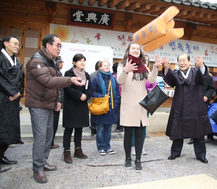 지난 22일 박홍섭 마포구청장은 창전동에 위치한 광흥당에서 열린 '정월대보름 민속놀이 행사'에 참여했다. 사진은 박홍섭 구청장(오른쪽)이 외국인들과 함께 윷놀이를 진행하고 있는 모습.(사진제공=마포구청)