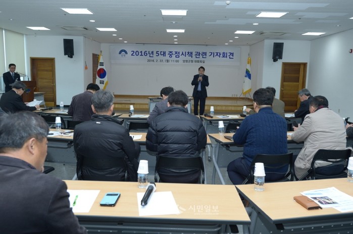 지난 22일 김선교 경기 양평군수는 군청대회의실에서 ‘2016년 군정 5대 중점 시책의 역점 추진을 위한 기자회견’을 실시했다. 사진은 기자회견에서 김 군수가 발언하는 모습.(사진제공=양평군청)
