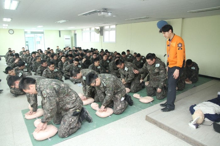 지난 22일 서울 은평소방서는 수도방위사령부 방패교육대를 방문해 국군장병 150여명을 대상으로 응급처치요원 양성교육을 실시했다. 사진은 교육에 참가한 장병들이 모형에 심폐소생술을 실습하는 모습.(사진제공=은평소방서)