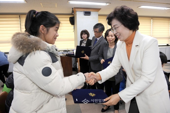 지난 22일 서울 송파구는 대회의실에서 ‘아동청소년 참여위원회 위촉식 및 교육’을 진행했다. 사진은 박춘희 구청장이 청소년에게 위촉장을 수여하고 격려하는 모습.(사진제공=송파구청)