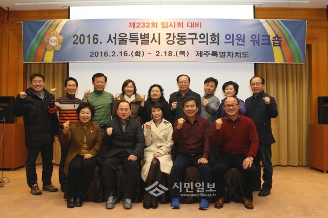 | ▲ 제주특별자치도에서 열린 워크숍에 참석한 강동구의회 의원들이 화이팅을 외치고 있다.(사진제공=강동구의회) | ||