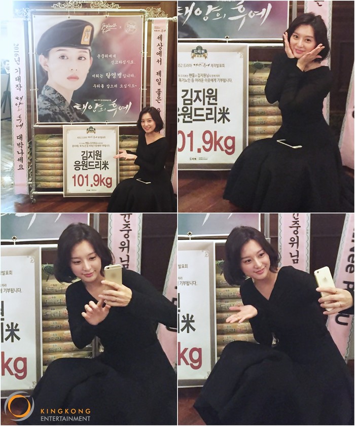 배우 김지원이 지난 22일 KBS 2TV 새 수목드라마 ‘태양의 후예’ 제작발표회에서 중국 팬들이 기부한 쌀 화환 앞에서 찍은 인증샷을 24일 공개했다.