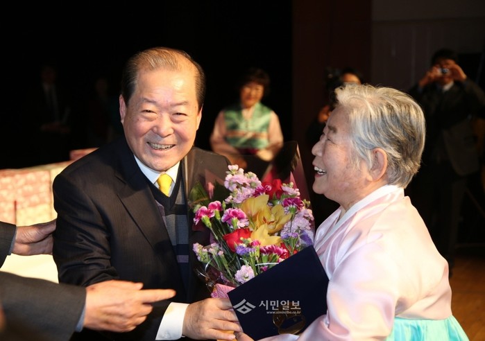 지난 23일 마포구 마포아트센터에서 양원초·양원주부학교의 합동졸업식이 개최됐다. 사진은 박홍섭 구청장(왼쪽)이 최고령 졸업생인 신복순씨(88·여)와 기념촬영을 하는 모습.(사진제공=마포구청)