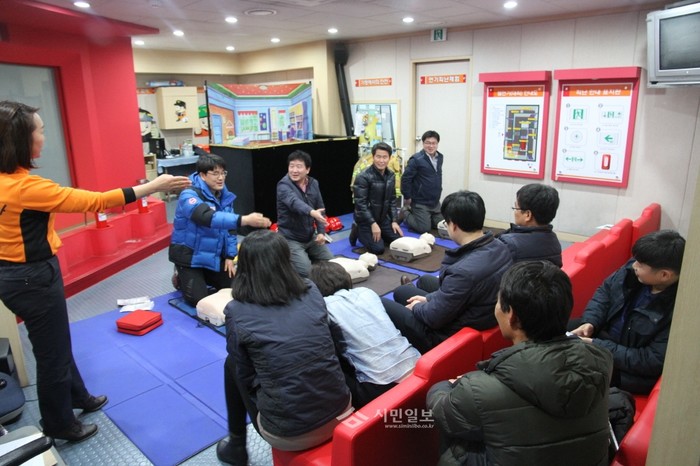 지난 23일 서울 동작소방서는 3층 소방안전체험교실에서 기상청 직원을 대상으로 심폐소생술 및 자동심장충격기 사용법 체험 교육을 실시했다. 사진은 관계자들이 심폐소생술 교육을 받는 모습.(사진제공=동작소방서)