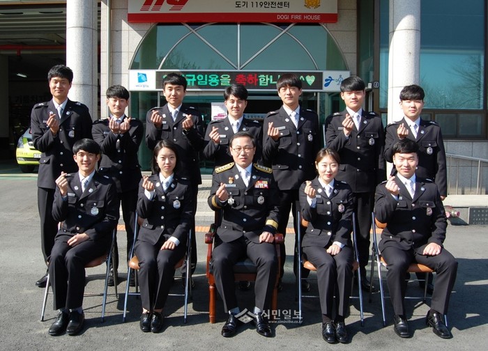 24일 경기 안성소방서는 경기도 소방공무원으로 임용된 신임 소방공무원 11명에 대해 임용장 수여 및 대화의 시간을 마련했다. 사진은 권은택 서장(가운데)과 관계자들이 기념촬영을 하는 모습.(사진제공=안성소방서)