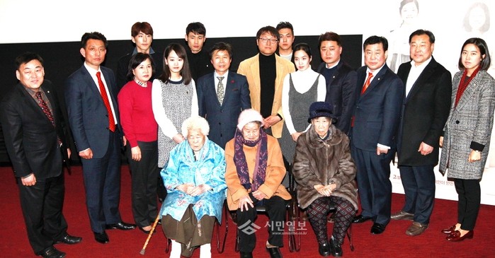 지난 22일 나상성 광명시의회 의장(왼쪽에서 다섯 번째) 등 의원들은 올해부터 일본군 위안부 피해자들의 삶의 질을 높여주기 위해 광명동굴 수입 중 1%를 기부하는 방안을 논의했다. 사진은 관계자들이 영화 '귀향' 시사회에 참석해 위안부 피해자와 함께 기념촬영을 하는 모습.(사진제공=광명시의회)
