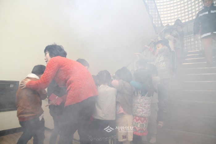 지난 24일 동작소방서는 상도3동 304-4 모든삐아제어린이집에서 원아 30명에게 '소방안전교육'을 실시했다. 사진은 교육에 참가한 어린이들이 연기피난체험을 하는 모습.(사진제공=동작소방서)