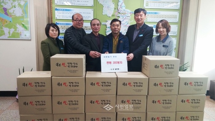 지난 24일 경기 여주시 중앙동 소재 ‘더 본 쌀 찐빵’은 불우이웃에게 전달해 달라며 중앙동 주민센터에 찐빵 300봉지(420만원 상당)를 기부했다. 사진은 관계자들이 기념촬영을 하는 모습.(사진제공=여주시청)