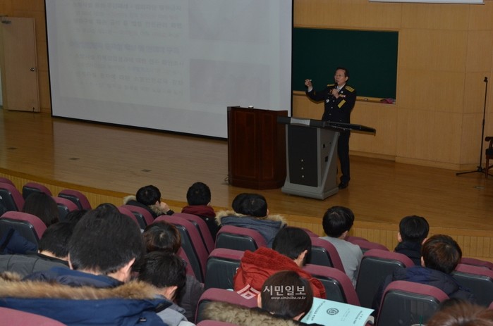지난 24일 서울 서대문소방서는 연세대학교 공학관에서 이과·공과·약학대학 대학원생 400명을 대상으로 소방안전관리 강의를 진행했다. 사진은 장현태 서장이 강의를 진행하는 모습.(사진제공=서대문소방서)