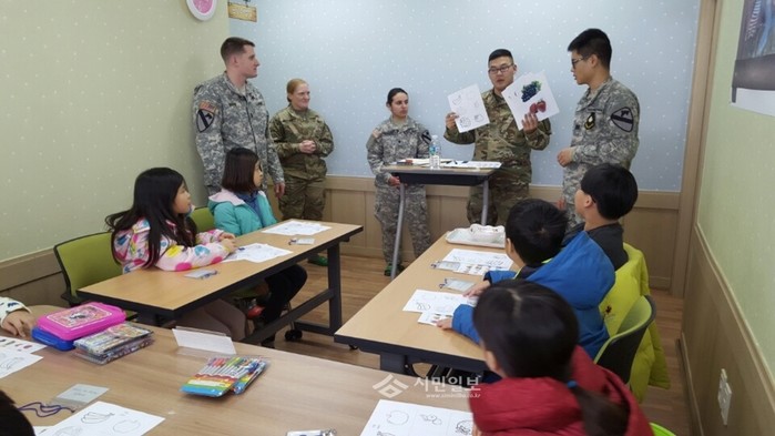 최근 경기 동두천시 드림스타트에서는 보산동 프로그램실에서 초등학생 아동, 미군 장병 등 30여명과 함께 ‘헬로우 영어교실’을 진행했다. 사진은 관계자들이 수업을 진행하는 모습.(사진제공=동두천시청)