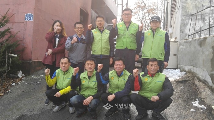 지난 27일 현대엘리베이터 사랑지기 봉사팀 회원 12여명은 1월 화재로 주택이 전소된 경기도 이천시 증포동에 위치한 이 모씨(75) 집을 찾아 장판 봉사활동을 진행했다. 사진은 관계자들이 기념촬영을 하는 모습.(사진제공=이천시청)