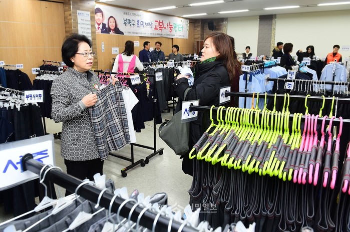 지난 26일 인천 부평구는 구청 지하상황실에서 인천부평지역자활센터와 공동 주관으로 ‘교복나눔 장터’를 개최했다. 사진은 홍미영 구청장(왼쪽)이 교복나눔 장터에 방문해 교복을 살펴보고 있는 모습.(사진제공=부평구청)