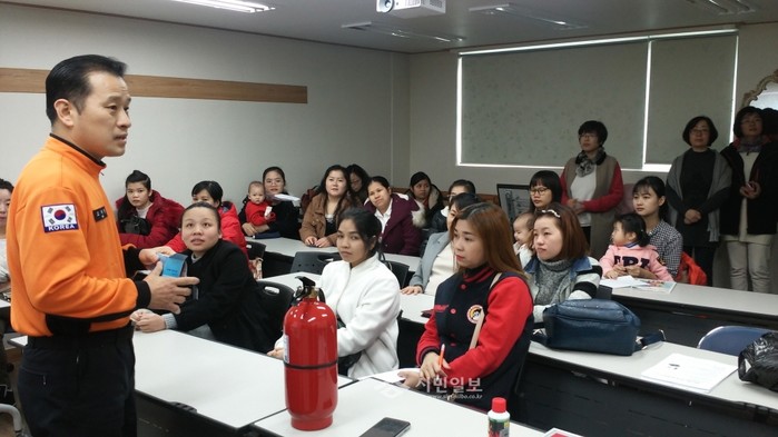 지난 26일 서울 은평소방서는 은평구다문화가족지원센터를 방문해 다문화가족을 대상으로 소방안전돌봄 서비스를 실시했다. 사진은 소방관이 소화기 사용법에 대한 교육을 진행하고 있는 모습.(사진제공=은평소방서)
