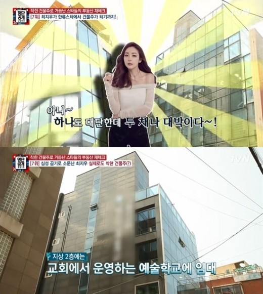 방송에 따르면 최지우는 지난 2006년 청담동 명품거리에 위치한 5층 건물을 54억에 매입, 현재 시세 100억으로 두배에 가까운 수익을 얻었다. 뿐만 아니라 지난 2013년 43억을 주고 매입한 역삼동 소재 5층 빌딩도 수익이 쏠쏠한 것으로 알려졌다.