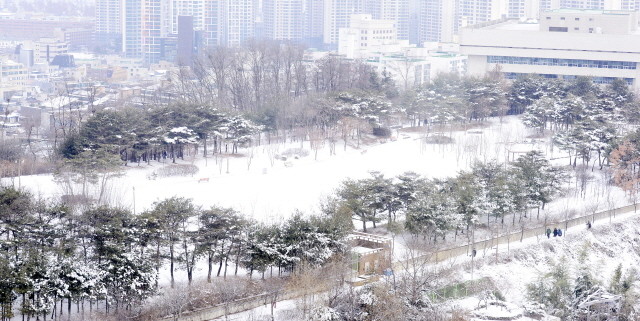 꽃샘추위와 함께 연 이틀 눈이 내린 29일 오전 서울 서초구 도심속 공원이 하얀눈으로 뒤덮여 있다.