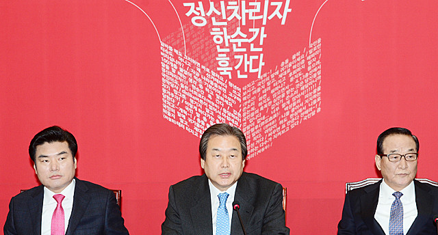 공천 살생부의 진위를 놓고 시끌벅적한 가운데 지난달 29일 오전 서울 여의도 국회에서 열린 새누리당 최고위원회의에서 김무성 대표가 당을 신랄하게 비판한 ‘뼈아픈 문구’ 앞에서 공천살생부에 대한 입장을 밝히고 있다.