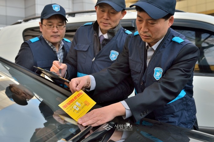 최근 3개 세무부서 팀장급 이상으로 편성된 '서울 송파구 고액 체납징수 전담반'이 밀린 세금 징수를 위해, 납부를 기피하는 한 지방세 체납자의 차량에 압류 스티커를 부착하고 있다.(사진제공=송파구청)