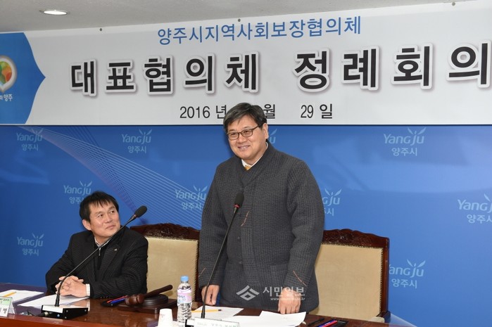지난달 29일 경기 양주시는 시청 상황실에서 양주시장 권한대행 김건중 부시장을 비롯해 대표협의체 위원 30명이 참석한 가운데 ‘지역사회보장협의체 대표협의체 회의’를 개최했다. 사진은 김 부시장(오른쪽)이 인사말을 하는 모습.(사진제공=양주시청)