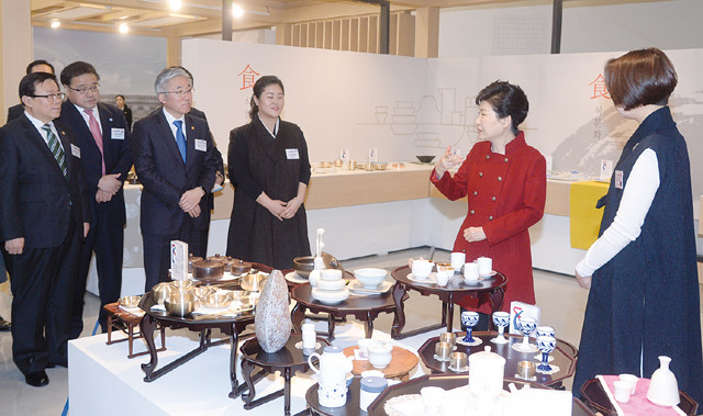 박근혜 대통령이 2일 오후 한국문화 및 우수문화상품 전시회 개막식이 열린 서울 동대문디자인플라자(DDP) 우수문화 상품 전시관에서 상품을 보며 참석자들과 대화하고 있다.