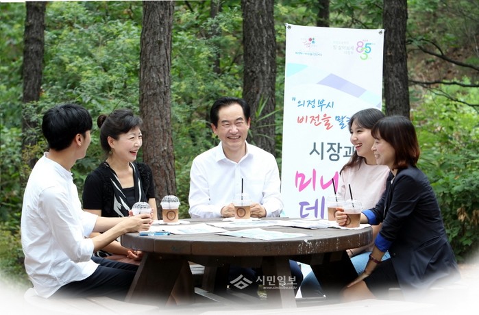 | ▲ 안병용 의정부 시장(가운데)이 시민들과 의정부시의 비전에 대한 이야기를 나누며 웃고 있다. | ||