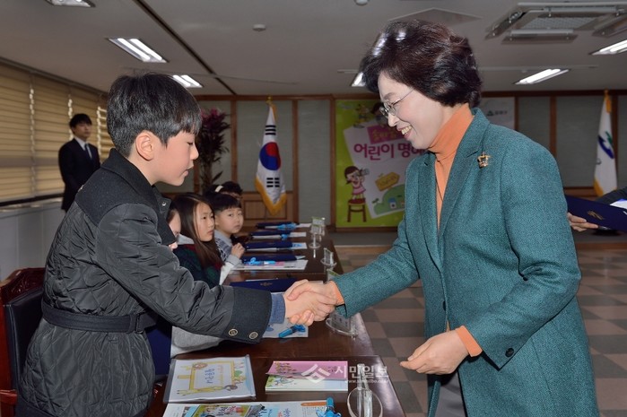 서울 송파구는 최근 구청 대회의실에서 2016 어린이소식지‘송파꿈나무’ 명예기자 위촉식을 개최했다. 사진은 박춘희 구청장이 명예기자로 위촉된 어린이를 격려하는 모습.(사진제공=송파구청)