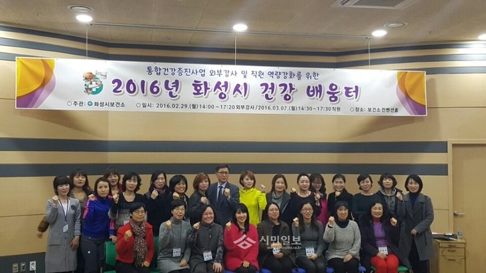 최근 경기 화성시 보건소는 100세 건강시대를 이끌 내·외부 보건인력의 역량강화를 위해 ‘2016 건강배움터’를 열고 노인 건강관리 담당자를 교육했다. 사진은 관계자들이 기념촬영을 하고 있는 모습.(사진제공=화성시청)