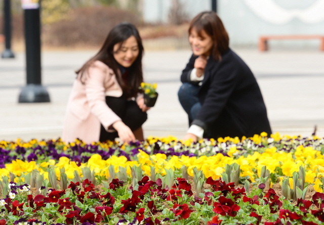 3일 오전 서울 성동구 왕십리역 광장 화단에서 성동구청 직원들이 봄꽃을 식재하고 있다.