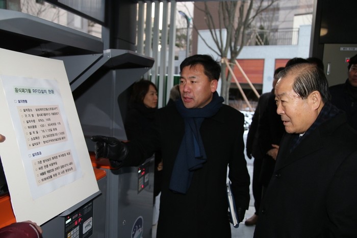 최근 박홍섭 서울 마포구청장(오른쪽)이 대흥동 소재 신규 아파트단지를 방문해 단지내 설치된 ‘RFID 개별 종량기’에 관한 설명을 듣고 있다. RFID 개별 종량제는 개별개량 장치에 음식물을 투입하면 배출량이 자동 계량돼 버린 만큼 수수료를 부과하는 방식이다.(사진제공=마포구청)