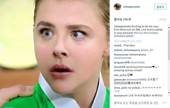 클로이 모레츠는 6일 오전(한국시간) 자신의 인스타그램을 통해 "Exciting to be the very First American on SNL Live and to speak in only Korean!!! #Korea #KimchiSlap #NOWOLSAEEE"이라는 글을 올렸다.